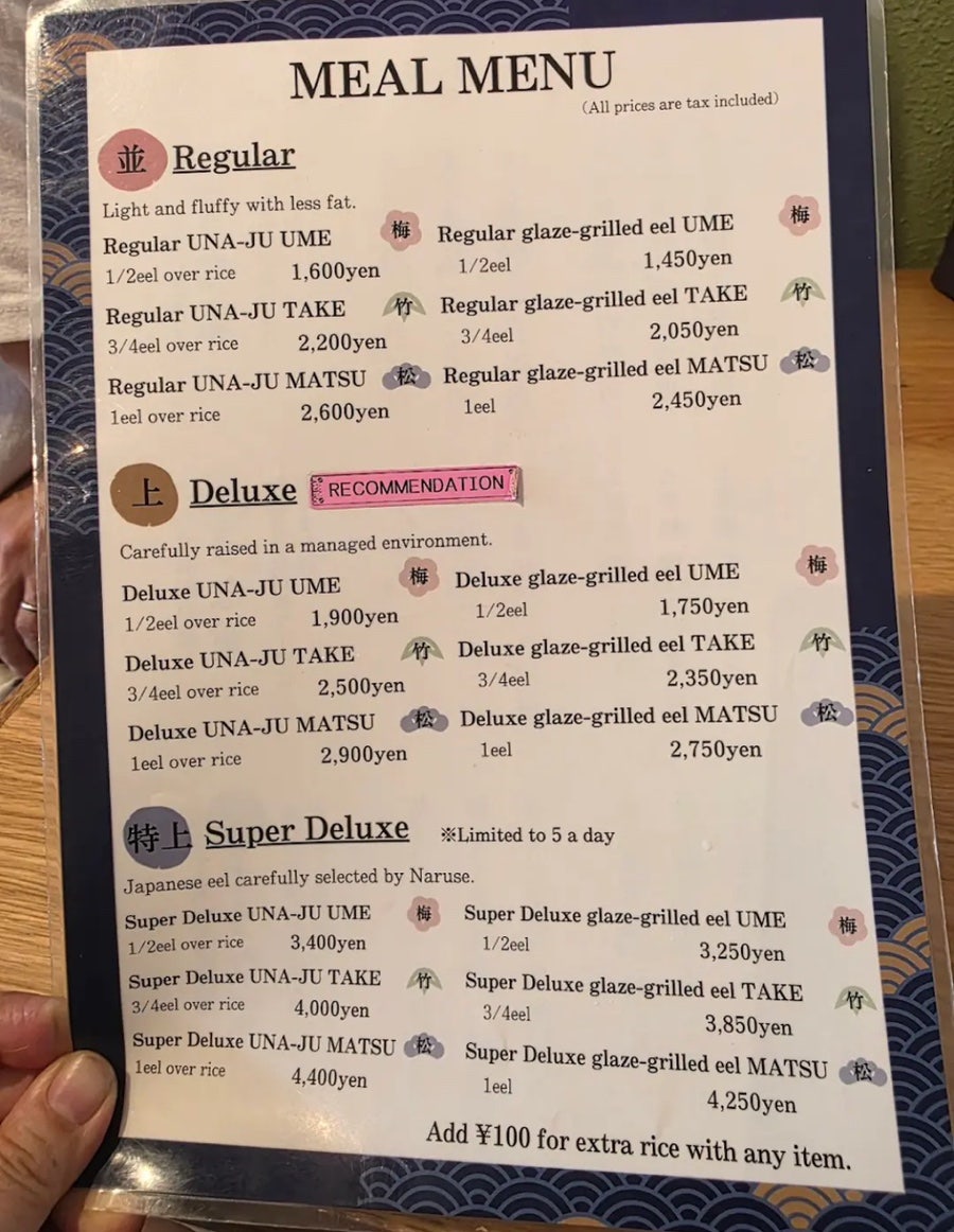 제가 주문한 건 우나쥬(うな重) 중(中) 사이즈, 가격은 2,500엔 정도였어요.